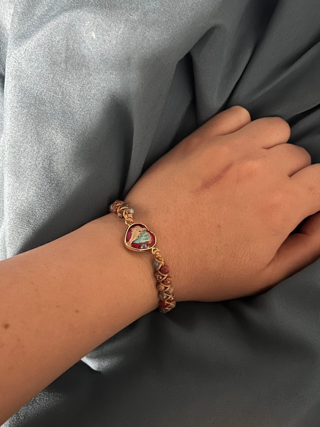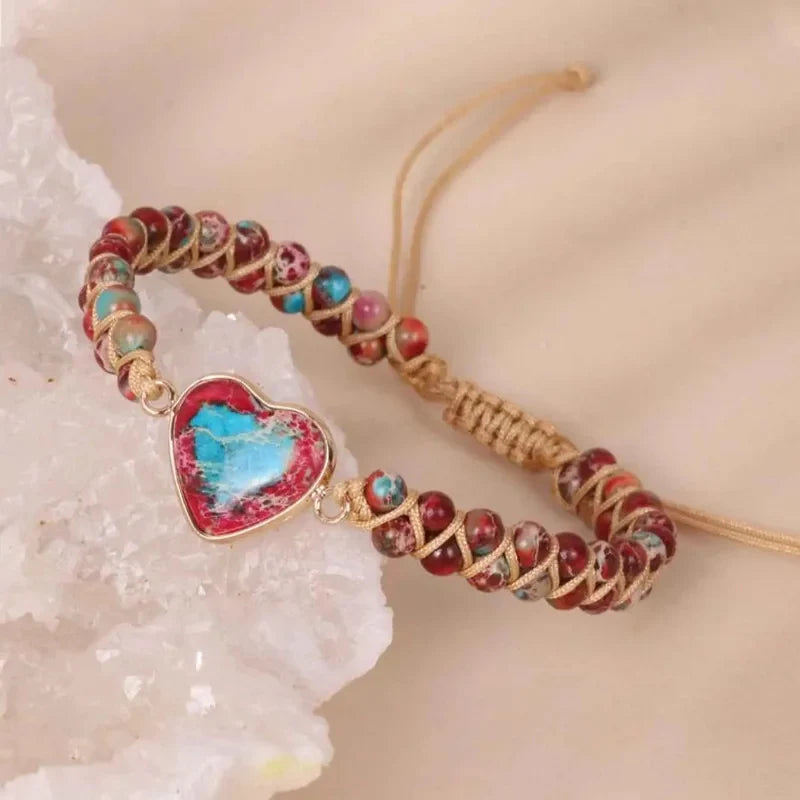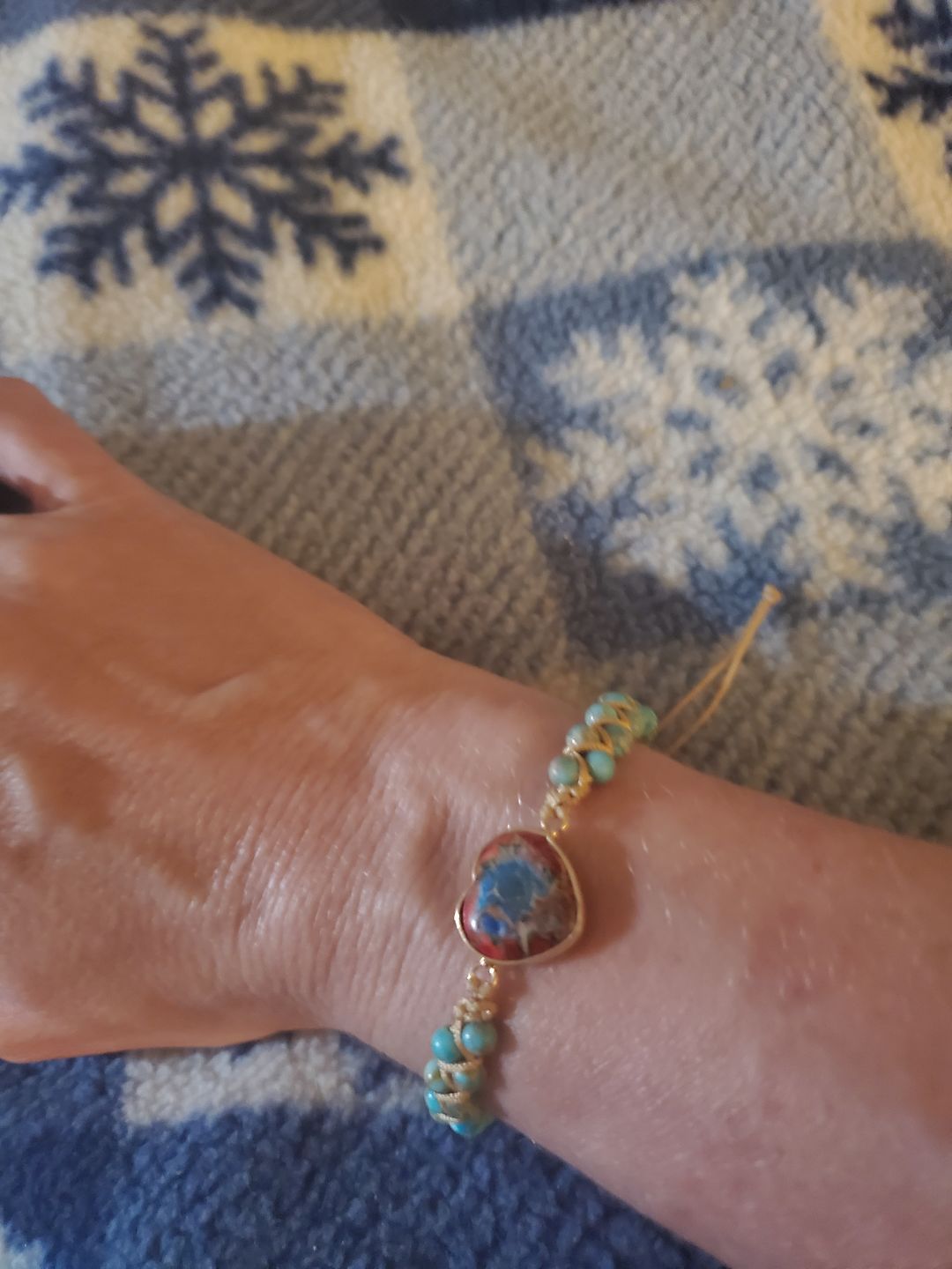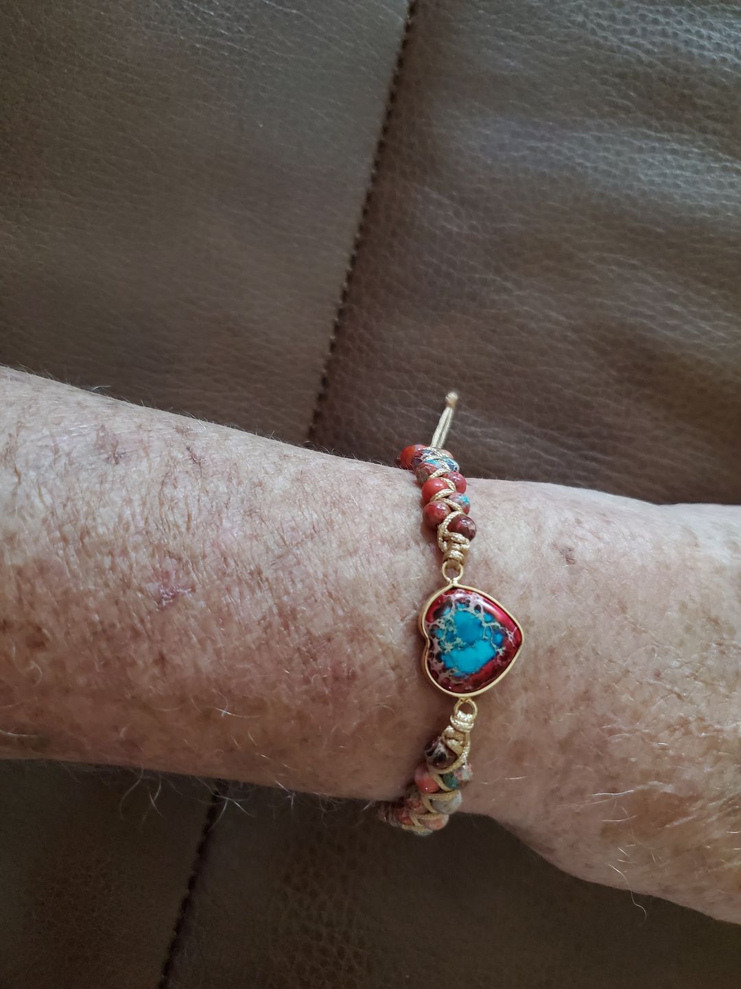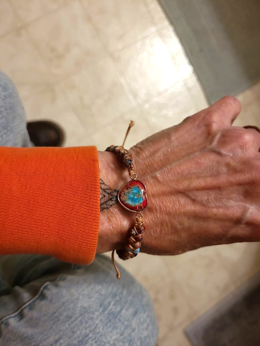 The woven parts of the bracelet are from different materials, such as linen, rope, steel rings and colored weaving material. The heart stone is a small unique piece of stone from larger quartzes that burst and are released under high pressure during the mining process. This gives a unique shape and color to the patterns in the heart.