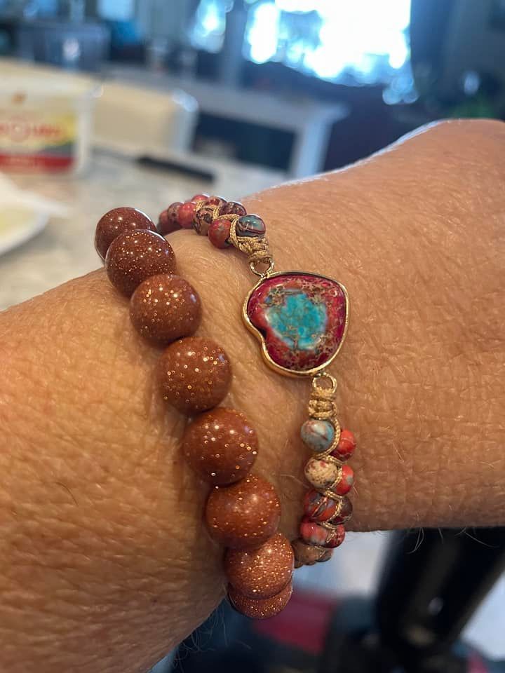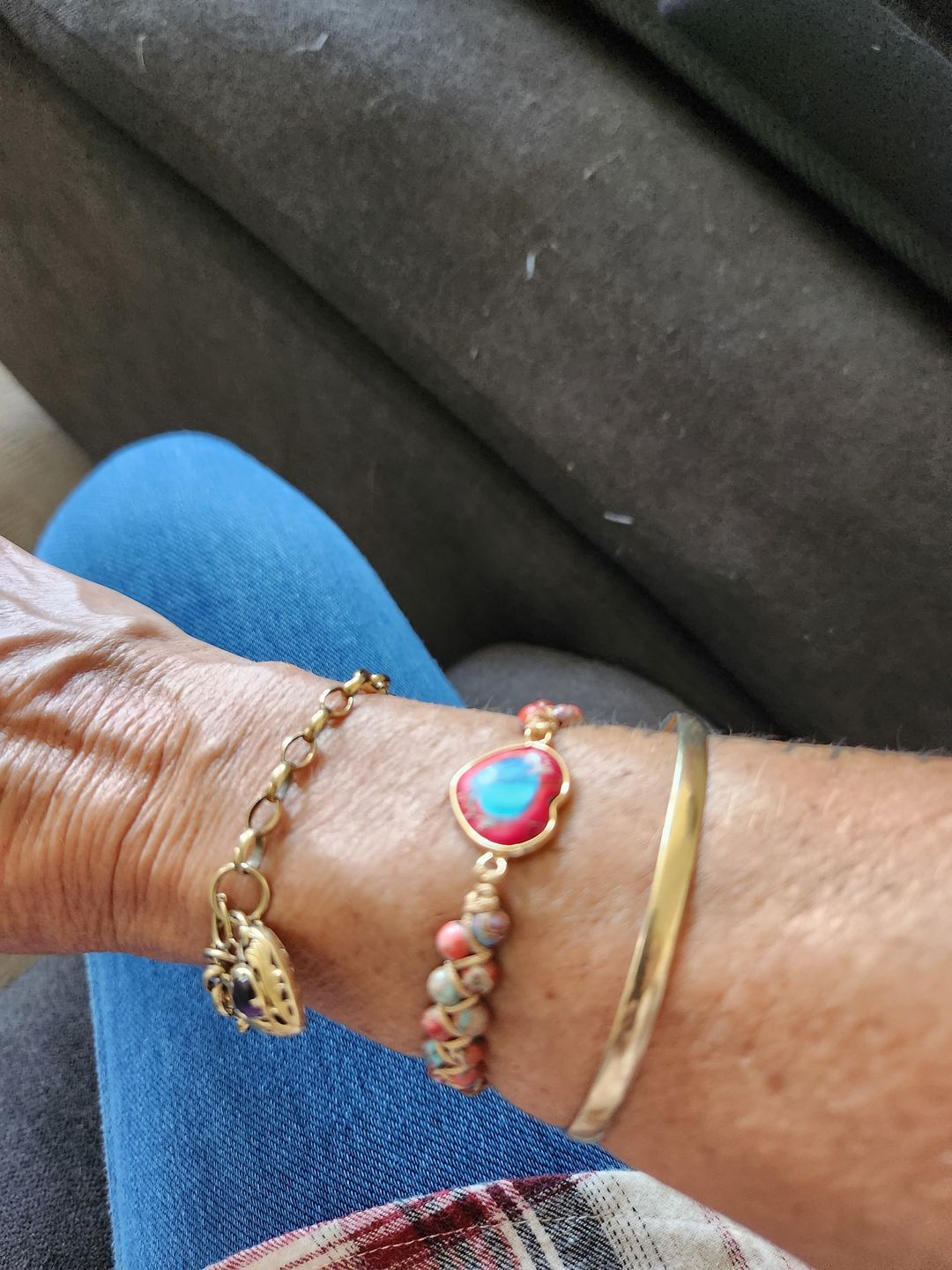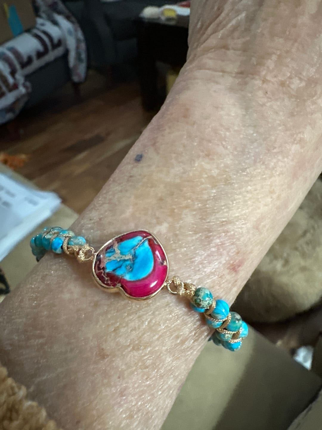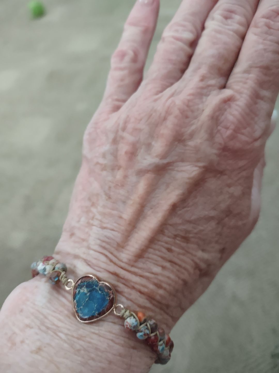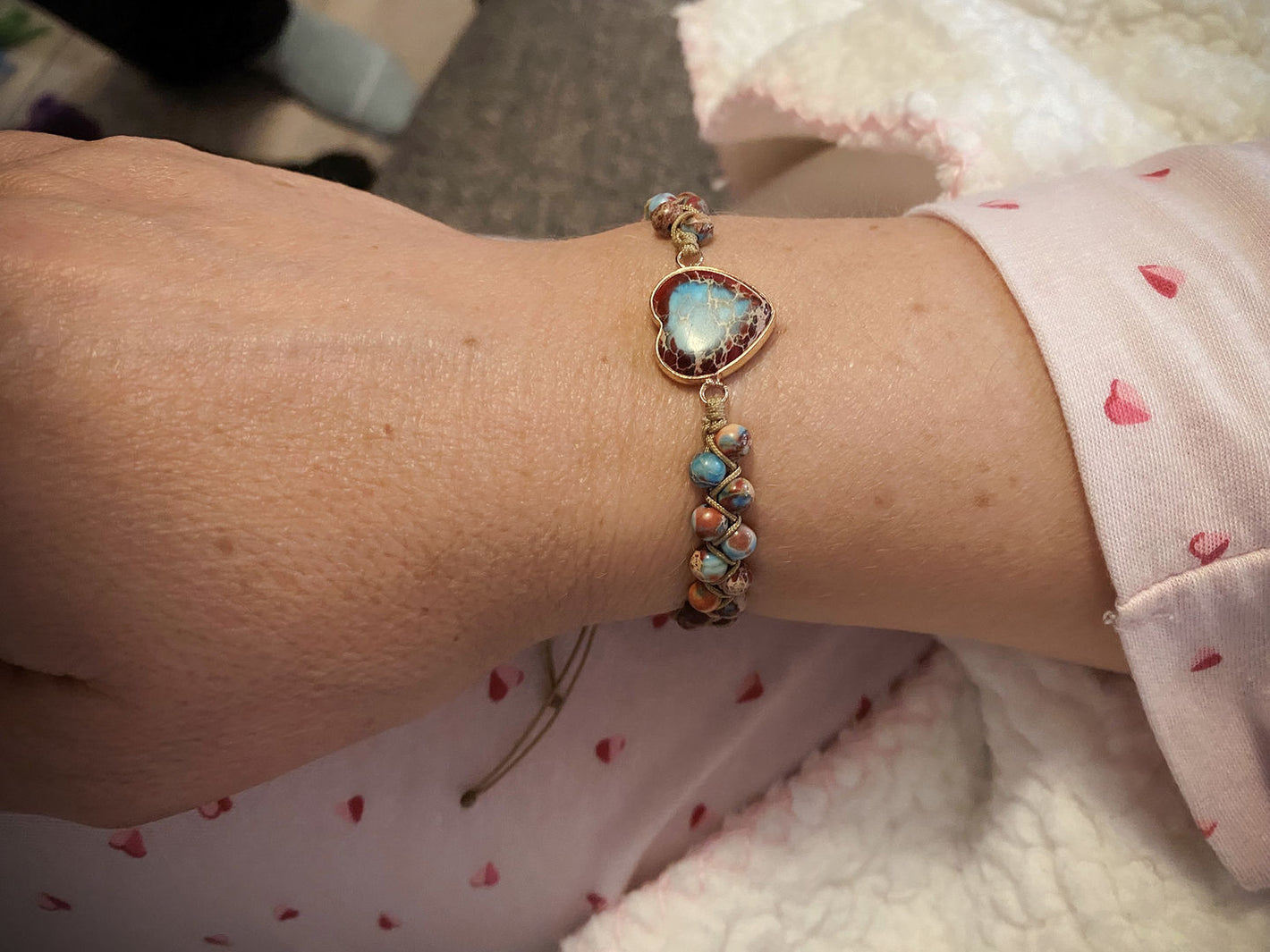 The woven parts of the bracelet are from different materials, such as linen, rope, steel rings and colored weaving material. The heart stone is a small unique piece of stone from larger quartzes that burst and are released under high pressure during the mining process. This gives a unique shape and color to the patterns in the heart.